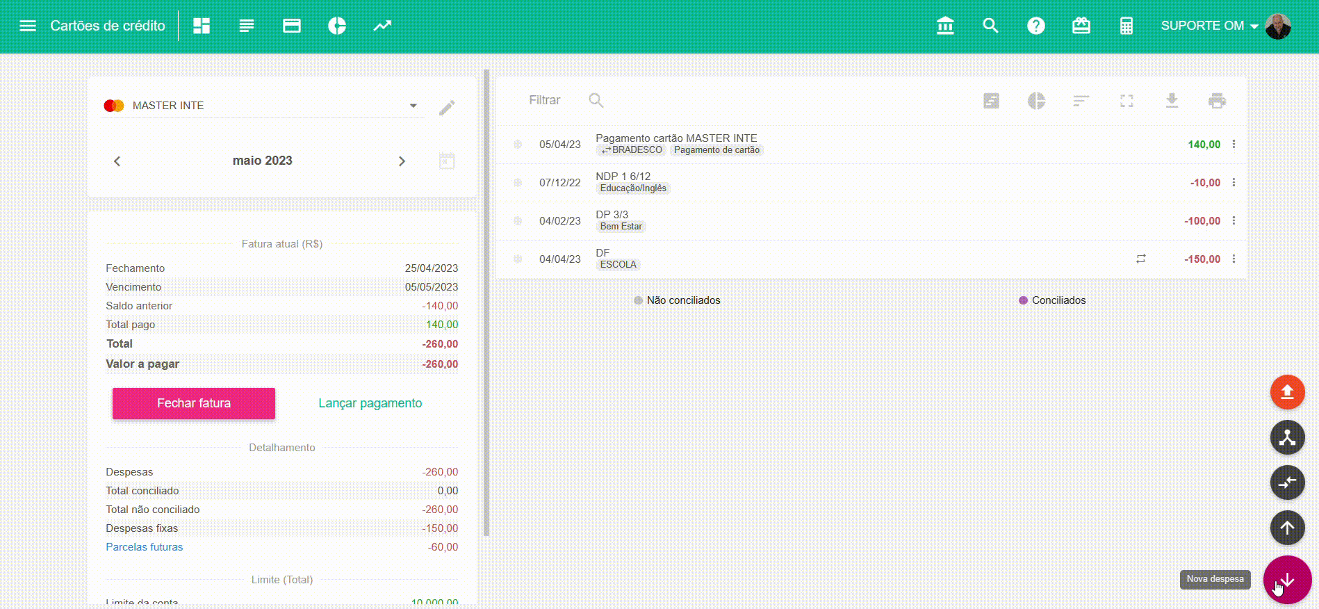 Após cadastrar o cartão, é preciso lançar todas as despesas para compor o saldo final da primeira fatura em aberto, na tela de cartões de crédito, abaixo.