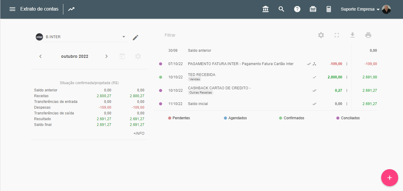 Sempre que um lançamento da fonte for utilizado para conciliar mais de um lançamento existente no Meu Dinheiro ou a função de ajuste seja utilizada para adicionar detalhes, um lançamento detalhado será criado em substituição aos lançamentos existentes no sistema. Veja o exemplo da importação acima na imagem a seguir.