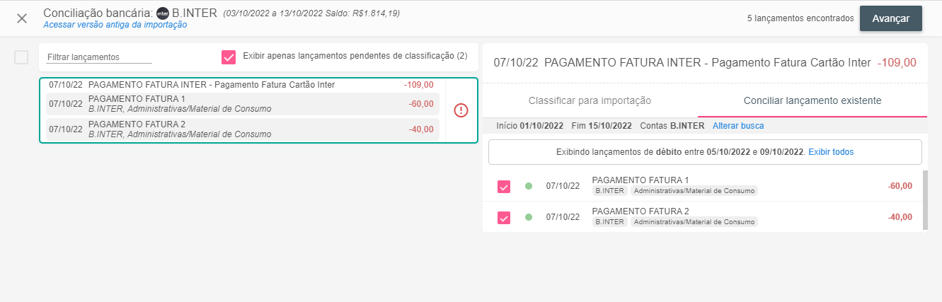 No caso de vincular um lançamento da fonte a mais de um lançamento existente, é necessário que o valor do lançamento da fonte seja igual à soma dos lançamentos que serão conciliados. Caso isto não ocorra o lançamento fica com o status de pendente de ajuste de valor indicado pelo ícone ![](https://3357234278-files.gitbook.io/~/files/v0/b/gitbook-x-prod.appspot.com/o/spaces%2F-LHiGwaIZy8DL2zdT3Ux%2Fuploads%2FCuIgWypPT8oiOSnmjXS4%2Fimage.png?alt=media\&token=b4b5655c-5523-418c-ac43-f1422f9fe255).