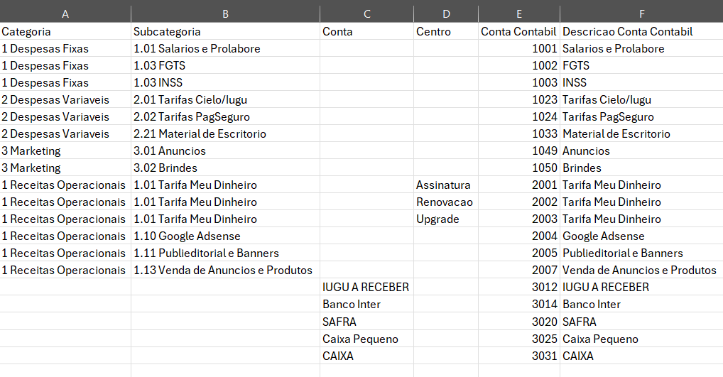 A colunas **D** pode ser preenchida com [centros](https://docs.meudinheiroweb.com.br/cadastros/centros), sempre que desejar vincular uma mesma [categoria](https://docs.meudinheiroweb.com.br/cadastros/categorias) e subcategoria (colunas **A** e **B)** ou [conta](https://docs.meudinheiroweb.com.br/cadastros/contas) (colunas **C)** a contas contábeis (coluna **E)** distintas. É importante preencher a colunas **D** com nomes de centros válidos no Meu Dinheiro.