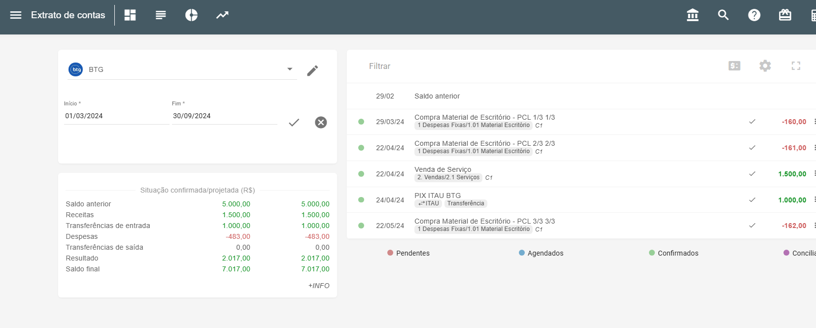 Movimentações financeiras a exportar, conforme demonstrativo abaixo, onde a compra de material de escritório e a venda de serviço têm data de competência em **março/2024** e foram pagas ou recebidas em 29/03, 22/04 e 22/05/2024.