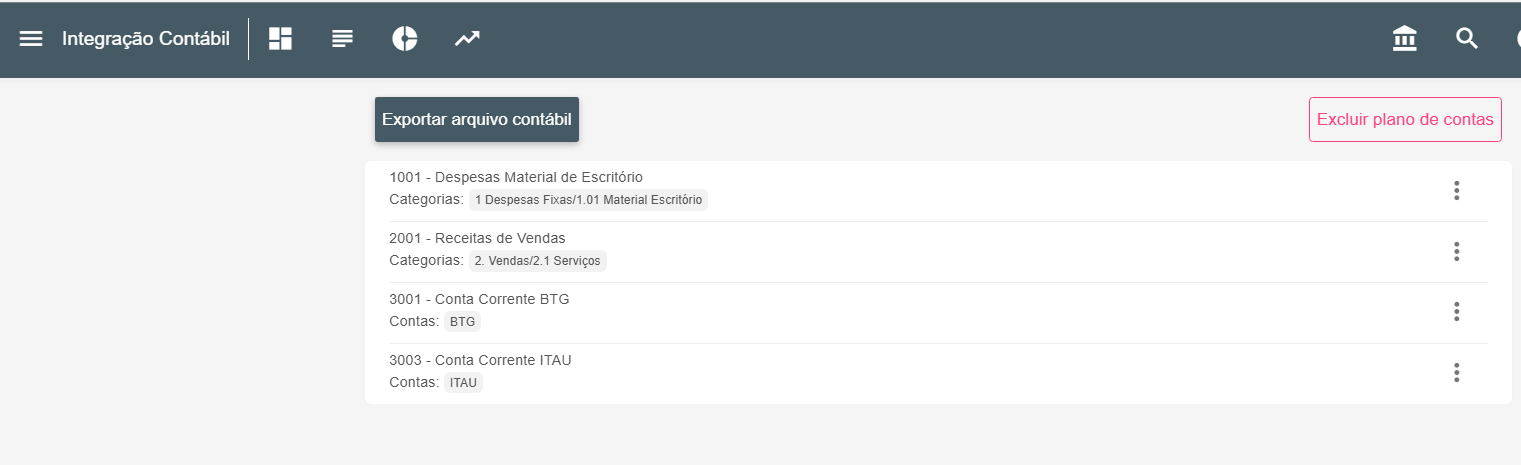 Após concluir a configuração do plano de contas contábeis é possível exportar a movimentação financeira, gerando um arquivo .csv que deverá ser importado no sistema da contabilidade.