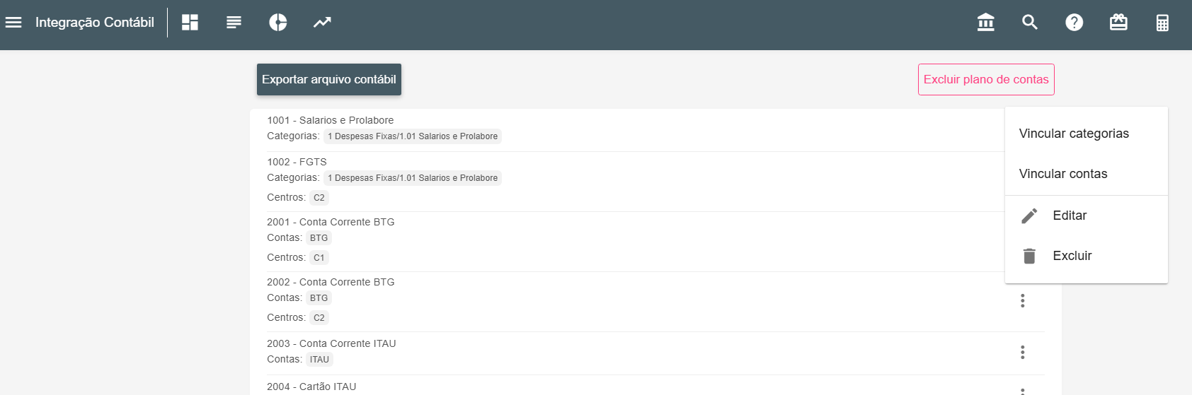 Após a importação da planilha inicial de configuração do plano de contas, a tela abaixo é exibida, mostrando todas as contas e as vinculações com as [Categorias](https://docs.meudinheiroweb.com.br/cadastros/categorias), [Contas ](https://docs.meudinheiroweb.com.br/cadastros/contas)e [Centros ](https://docs.meudinheiroweb.com.br/cadastros/centros)do Meu Dinheiro.