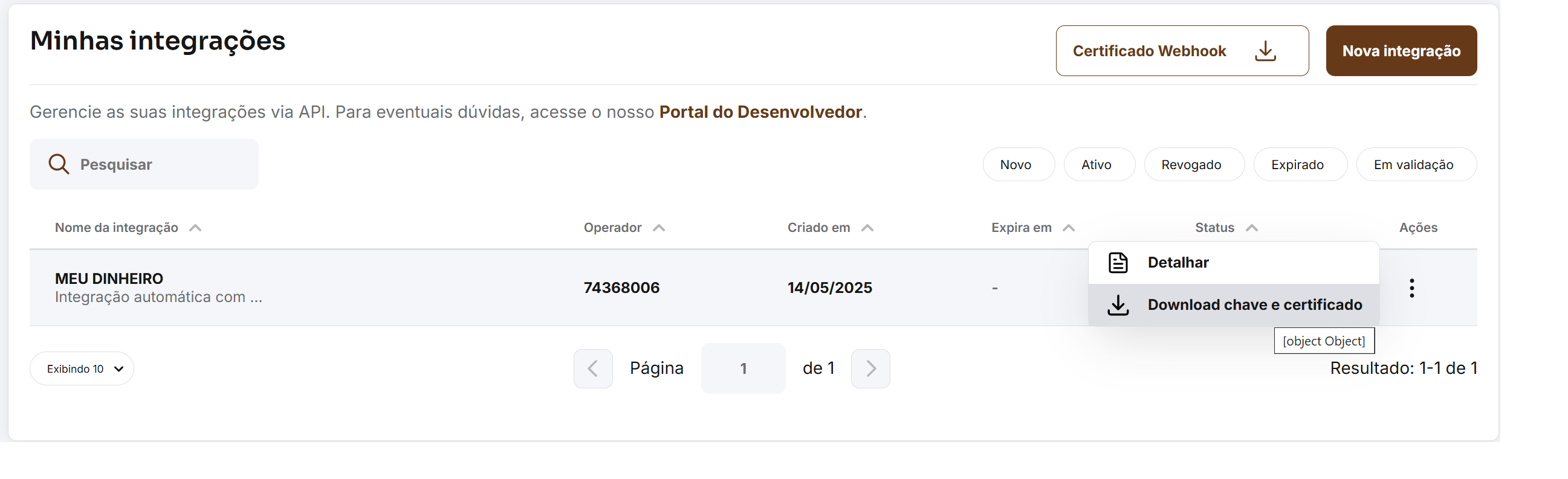 Use o menu de ações do painel Minhas integrações, para baixar a chave e o certificado da integração criada, conforme imagem abaixo.