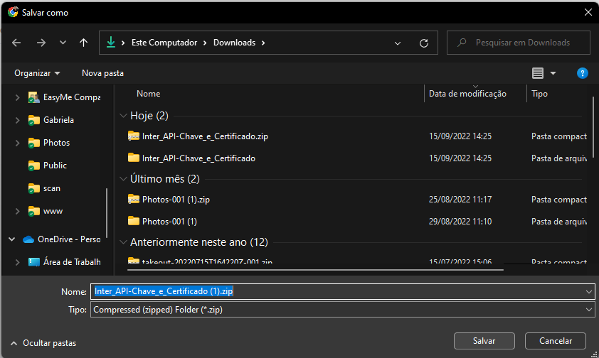<figure><img src="https://3357234278-files.gitbook.io/~/files/v0/b/gitbook-x-prod.appspot.com/o/spaces%2F-LHiGwaIZy8DL2zdT3Ux%2Fuploads%2FLLahyRKE45cdNakynjYn%2FBaixar%20chave%20e%20certificado.png?alt=media&#x26;token=ffef0a16-e10b-4b1d-8c2b-397b726a1c6c" alt=""><figcaption><p>Baixando arquivo compactado com chave e certificado</p></figcaption></figure>