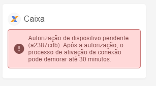 <figure><img src="https://3357234278-files.gitbook.io/~/files/v0/b/gitbook-x-prod.appspot.com/o/spaces%2F-LHiGwaIZy8DL2zdT3Ux%2Fuploads%2FT6FrDFb5TGs5iC0yN5v4%2Fimage.png?alt=media&#x26;token=31da4fbf-ccab-4d8c-86a2-5d64b6525420" alt=""><figcaption><p>Conexão da Caixa pendente de ativação</p></figcaption></figure>