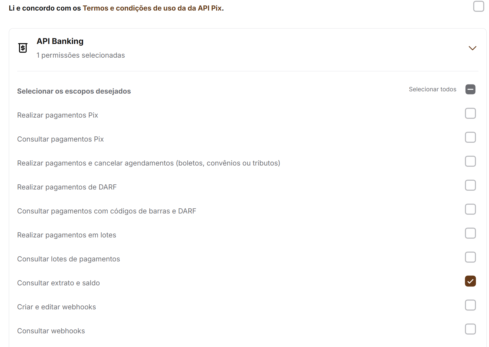 <figure><img src="https://3357234278-files.gitbook.io/~/files/v0/b/gitbook-x-prod.appspot.com/o/spaces%2F-LHiGwaIZy8DL2zdT3Ux%2Fuploads%2FTNT45KEuXTvd9GxDWHVz%2FAPI%20BANKING%20.png?alt=media&#x26;token=e3f6c001-9c03-4a21-9a26-ef36bb0a6de3" alt=""><figcaption><p>Utilize apenas a opção de Consultar extrato e saldo</p></figcaption></figure>