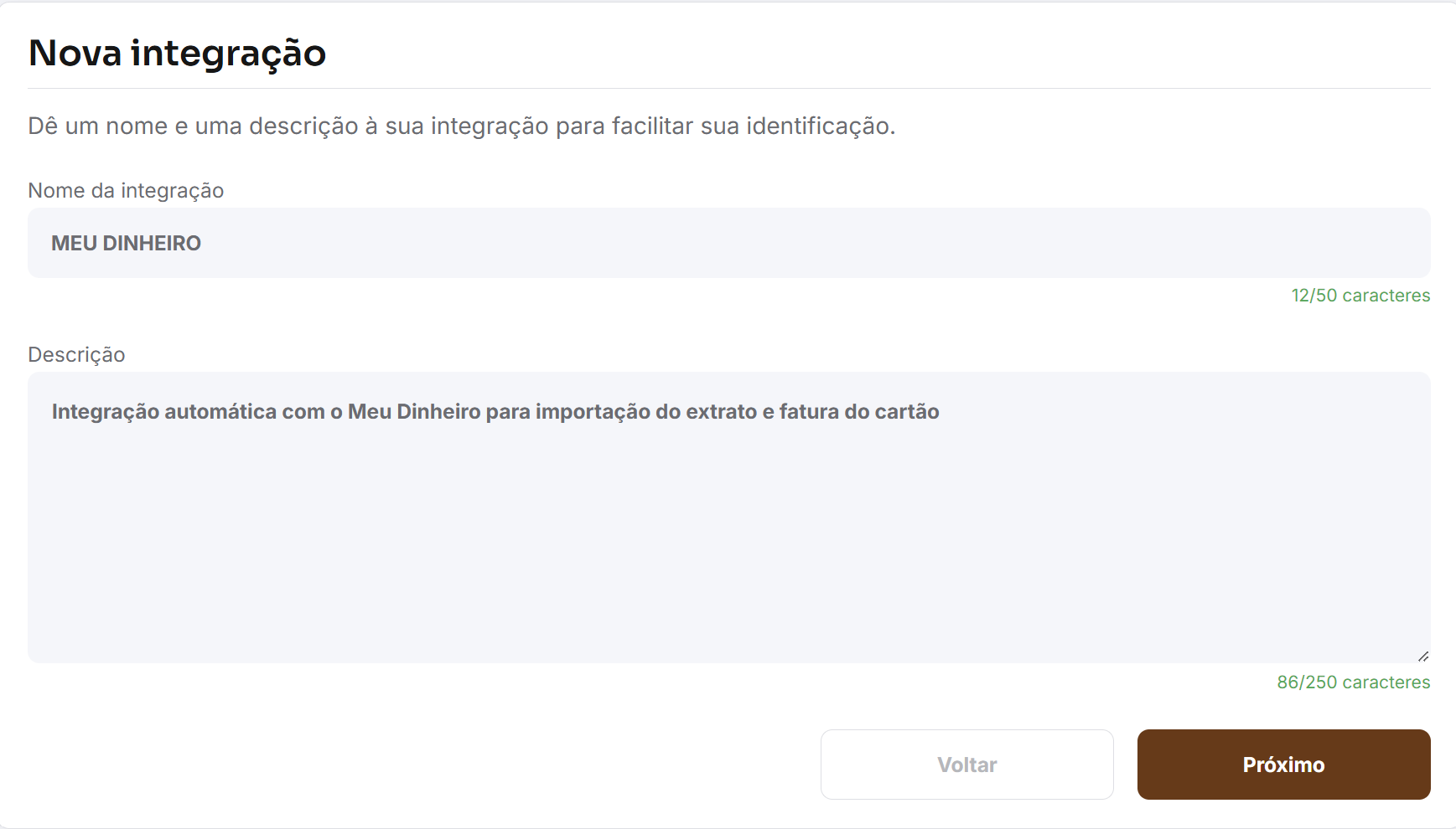 <figure><img src="https://3357234278-files.gitbook.io/~/files/v0/b/gitbook-x-prod.appspot.com/o/spaces%2F-LHiGwaIZy8DL2zdT3Ux%2Fuploads%2FuMEgOnBCDKBicEZtqM9c%2FNova%20integracao.png?alt=media&#x26;token=d39b9d31-1847-479d-bf78-1597190f64d7" alt=""><figcaption><p>Nome e descrição da Integração</p></figcaption></figure>