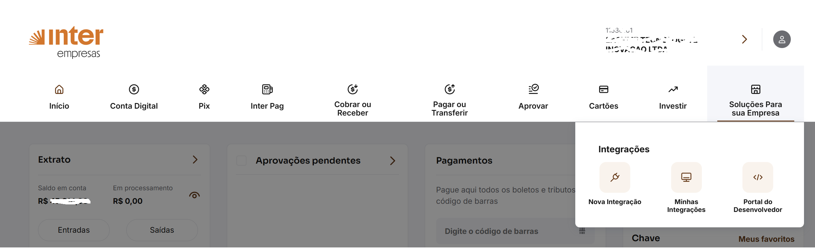 O processo é bem simples. O primeiro passo é acessar a conta da empresa no Internet Banking do banco Inter, para obter as credenciais de acesso (cliente id e client secret) bem como a chave e certificado de segurança. Se preferir, veja o processo na própria documentação do Banco Inter, clicando [aqui](https://developers.inter.co/docs/introducao/como-criar-uma-aplicacao).